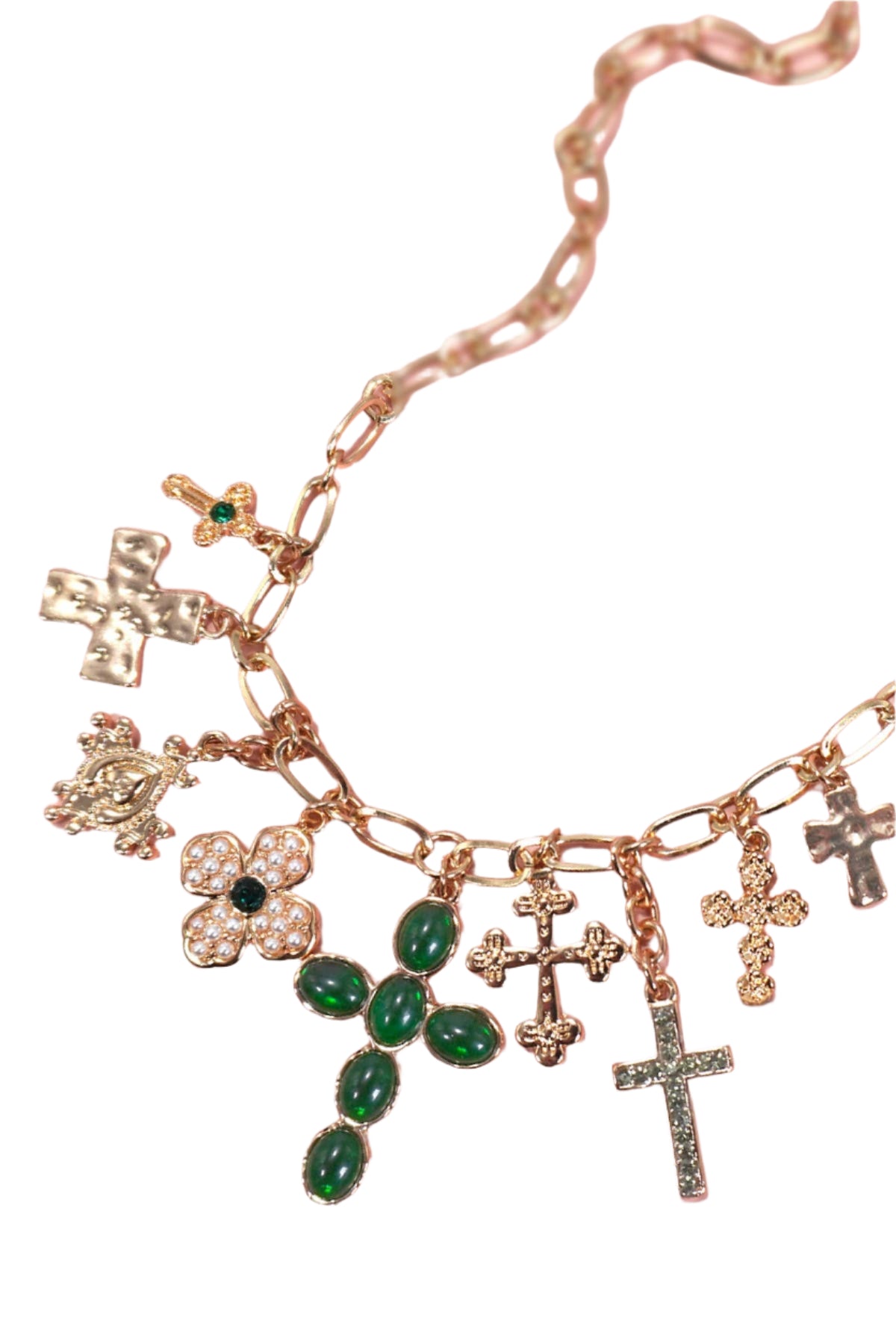 Multi Cross Charms Jade Classic Pearl Necklace blends elegance and symbolism with its exquisite design. Featuring classic cross, pearl cross, jade accents and multiple cross charms necklace.